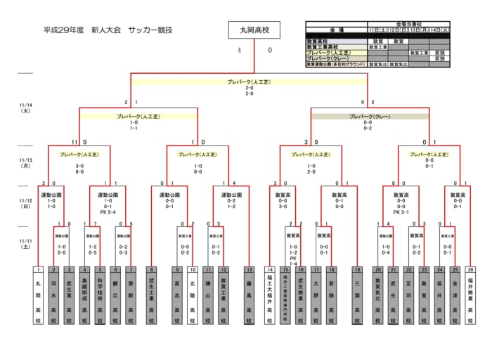 11/11(土)敦賀高校、敦賀工業高校、敦賀総合運動公園11/12(日)敦賀総合運動公園、敦賀高校11/13(月)おおい町総合運動公園球技場11/14(火)おおい町総合運動公園球技場、おおい町総合運動公園多目的グランド