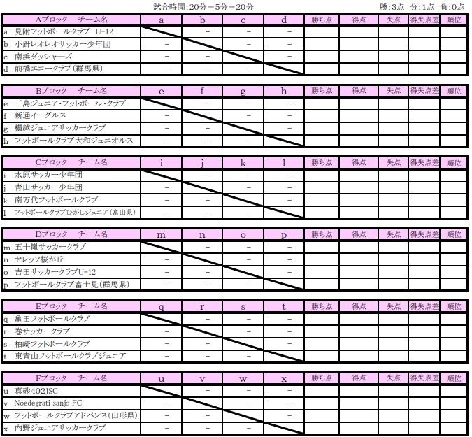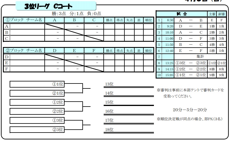 (4)優勝決定戦のみ、同点の場合、延長戦(5分ハーフ)、さらに同点の場合PK戦(5名)を行う。