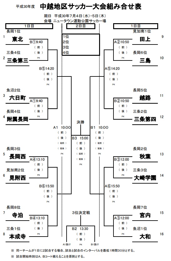 3) 準決勝・決勝の試合時間は、30分-7分-30分とする。決しない場合は10分の延長を行い、決しない場合は PK 方式により決定する。