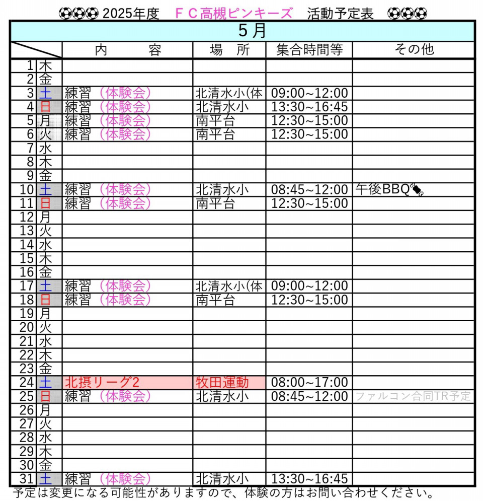 (体験会)と書いてある以下の日は、練習に一緒に参加して頂ける日です。