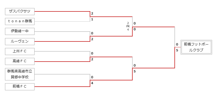 優 勝:前橋フットボールクラブ 準優勝:ルーヴェン高崎FC U-15 第3位:ザスパクサツ群馬 U-15 第3位:高崎フットボールクラブ