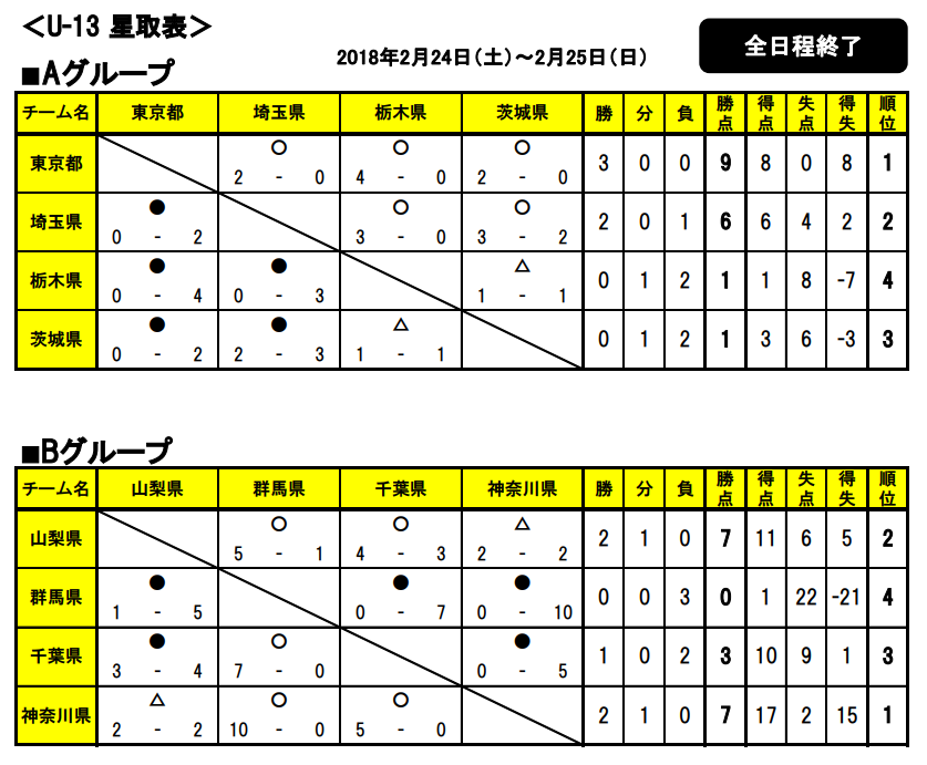 優勝:神奈川県トレセン準優勝:東京都トレセン第3位:埼玉県トレセン第4位:山梨県トレセン第5位:千葉県トレセン第6位:茨城県トレセン第7位:栃木県トレセン第8位:群馬県トレセン