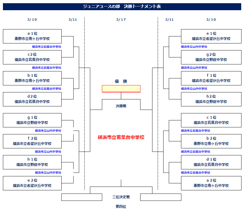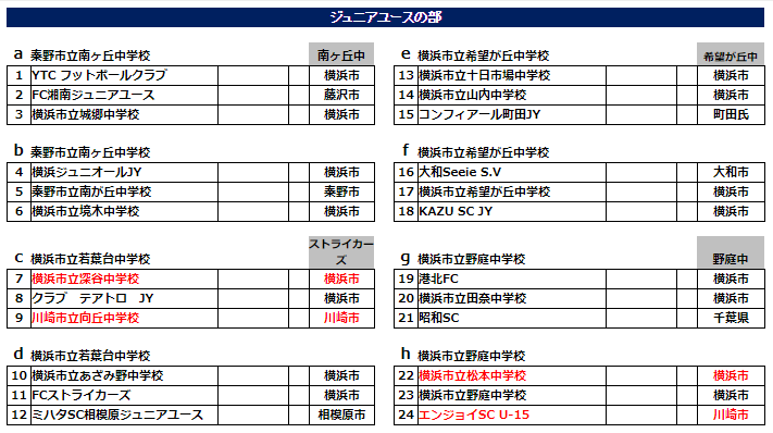 横浜市:16、神奈川県その他郡市:6、東京都:1、千葉県:1、合計24チーム(中体連、クラブジュニアユース:各12)が参加します。
