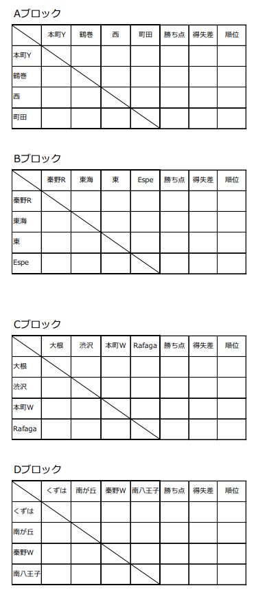 町田 JFC(町田市)、南八王子SC(八王子市)、FC エスペランサ(世田谷区)、Rafaga CF(群馬県)