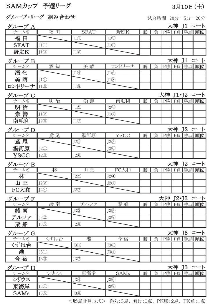 ・予選リーグで同点の場合は、PK戦により勝者を決定する(SAM・PK戦要項参照)。
