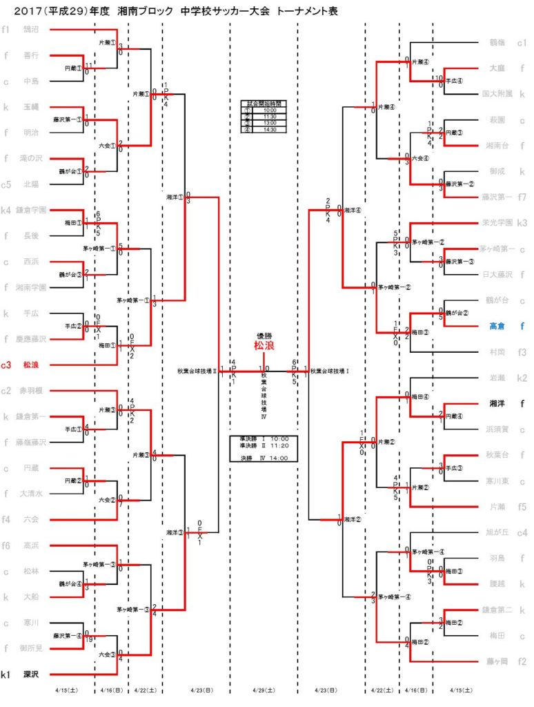 優 勝:茅ケ崎市立松浪中学校準優勝:藤沢市立高倉中学校第3位:鎌倉市立深沢中学校第3位:藤沢市立湘洋中学校参照:湘南地区中学校サッカー