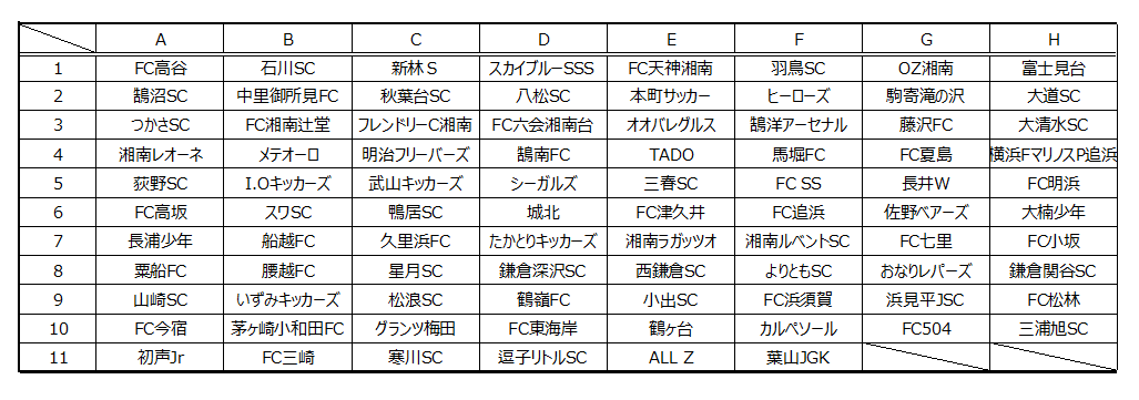 湘南地区の参加チーム数は86チーム。8ブロック(A~H)に分けてリーグ戦を行う。前期リーグの成績で後期リーグを行う。