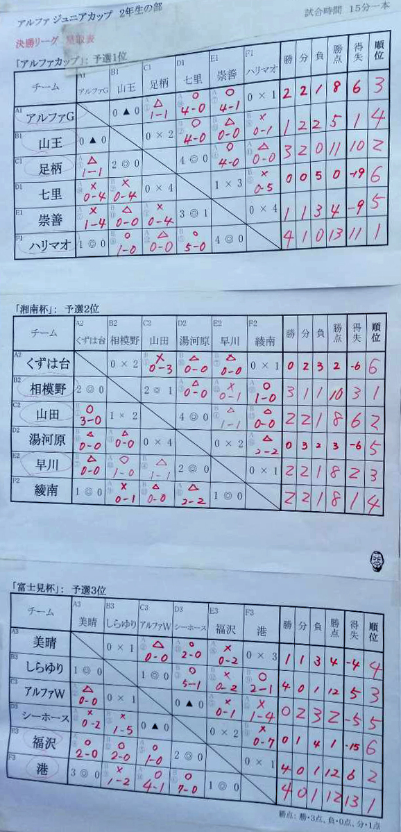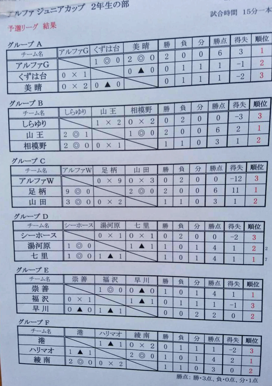 ・順位決定は、順位決定は、勝点方式 (勝ち:3点、引き分け:1点、負け:0点) 、勝点が同じ場合は、得失点・ジャンケンの順で、順位を決定。
