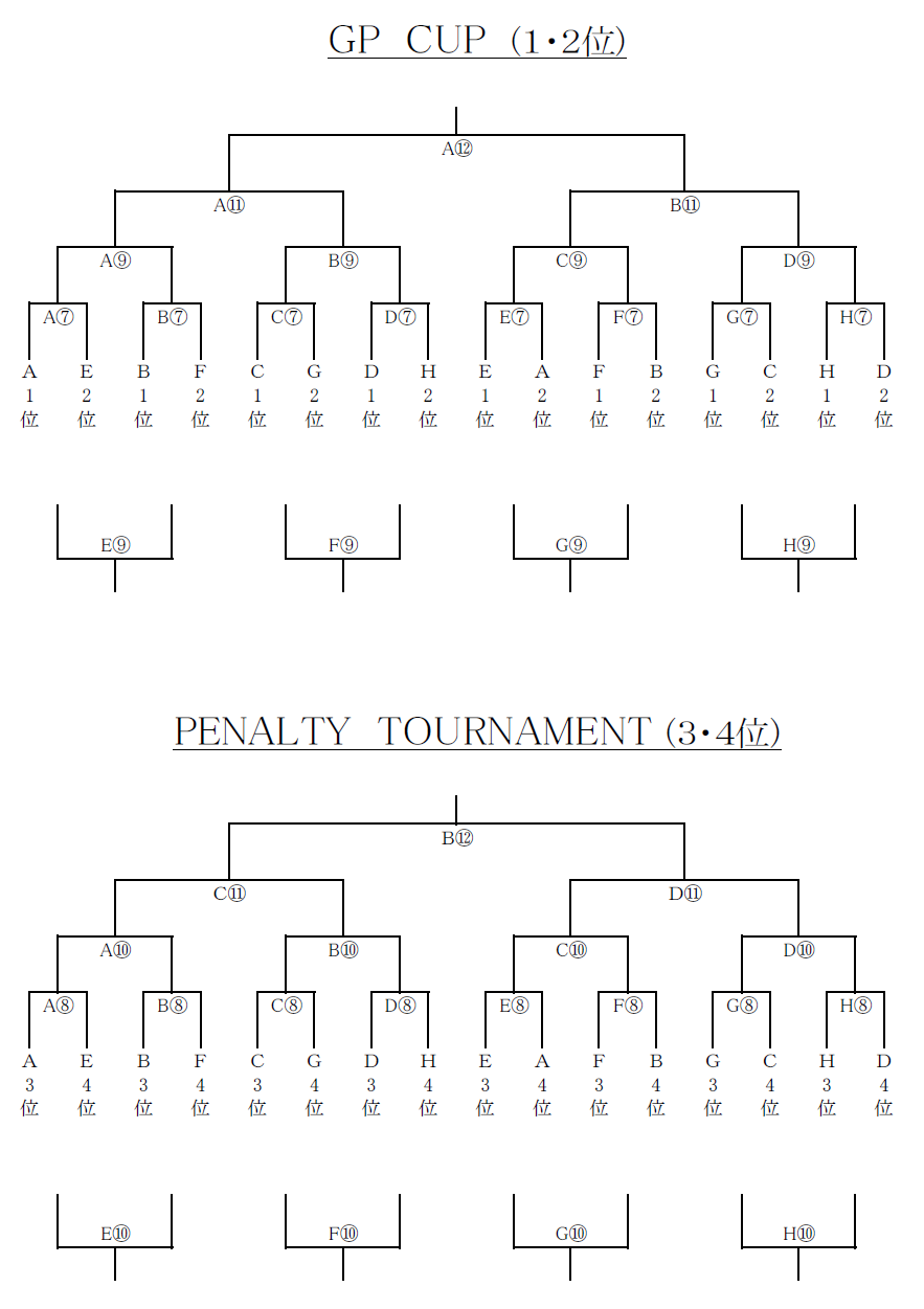 32チームが参加して、8ブロック(A~H)に分かれて予選リーグを行い、予選1・2位によるGP CUPトーナメントと予選3・4位によるPENALTY TOURNAMENTを行う。