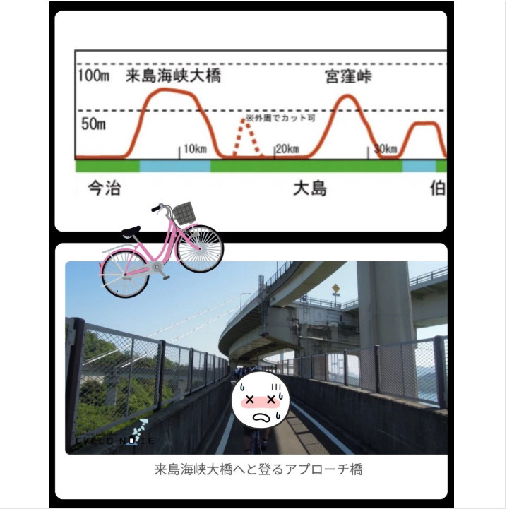 このまま壁にそっていけば、来島海峡大橋へ!というところで、みたこともない急な坂道にたどりつきました。スキーのジャンプ台のような坂!