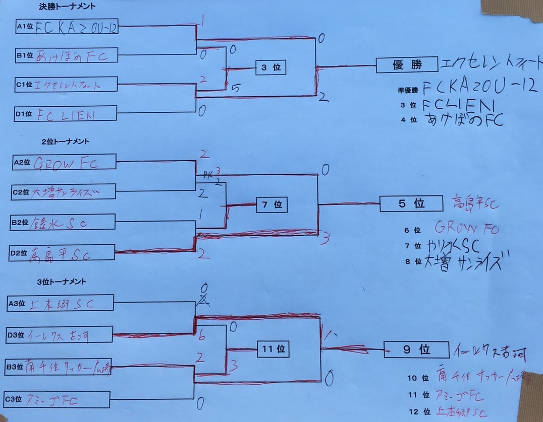 <決勝>エクセレントフィート 2-0 FCKAZO U-12<3位決定戦>FCLIEN 5-0 あけぼのFC<準決勝>エクセレントフィート 2-0 FCLIENFCKAZO U-12 1-0 あけぼのFC
