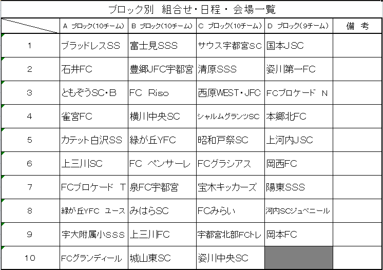 宇都宮市:石井グランド、平出サッカー場、白沢グランド、市内小学校グランド、 他