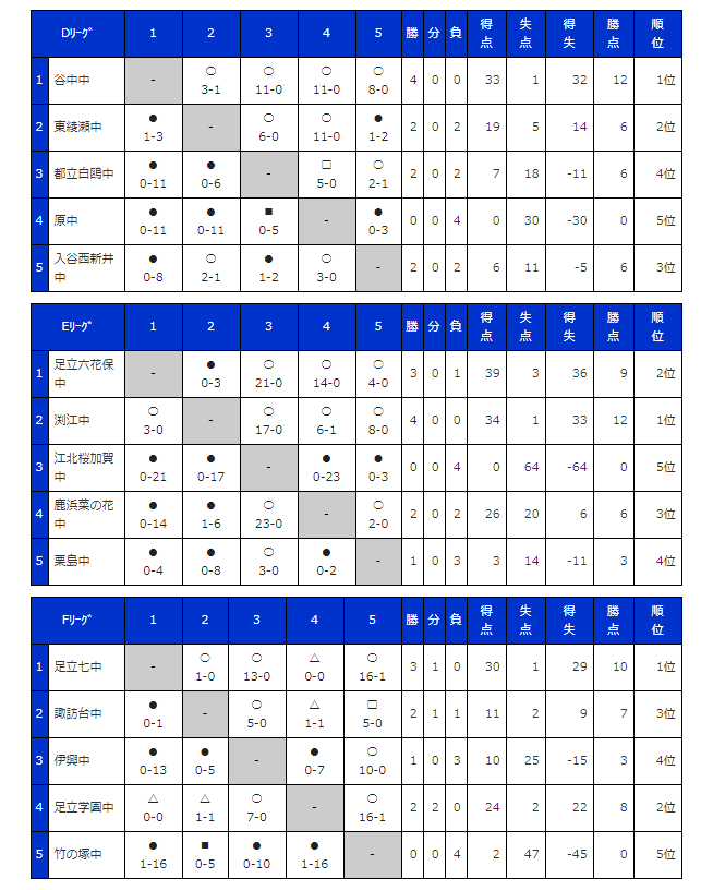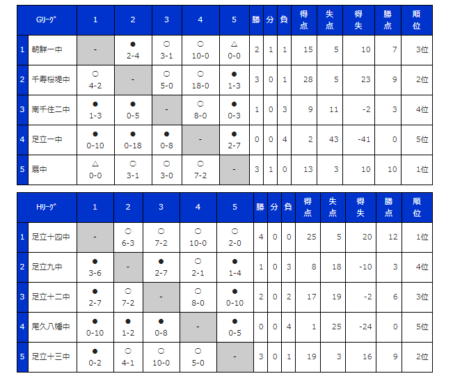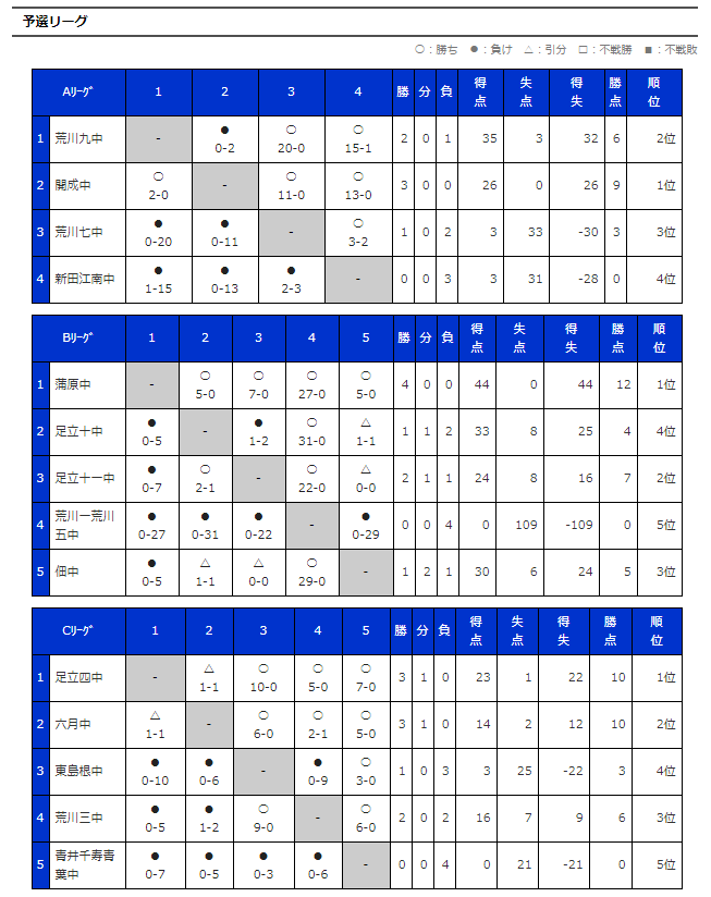 予選リーグ全日程が終了し、以下のチームの決勝トーナメント進出が決定いたしました。 Aリーグ 1位 開成中 2位 荒川九中 Bリーグ 1位 蒲原中 2位 足立十一中 Cリーグ 1位 足立四中 2位 六月中 (得失点差委により順位決定) Dリーグ 1位 谷中中 2位 東綾瀬中(得失点差により決定) Eリーグ 1位 渕江中 2位 足立六花保中 Fリーグ 1位 足立七中 2位 足立学園中 Gリーグ 1位 扇中 2位 千寿桜堤中 Hリーグ 1位 足立十四中 2位 足立十三中