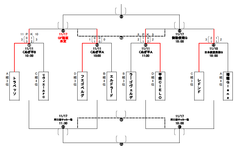 <本大会のシード権:VF甲府(関東リーグ所属)、フォルトゥナSC(前年度メトロポリタンリーグ所属)、Uスポーツクラブ(前年度U13リーグ1位)、韮崎SC(前年度U13リーグ2位)>