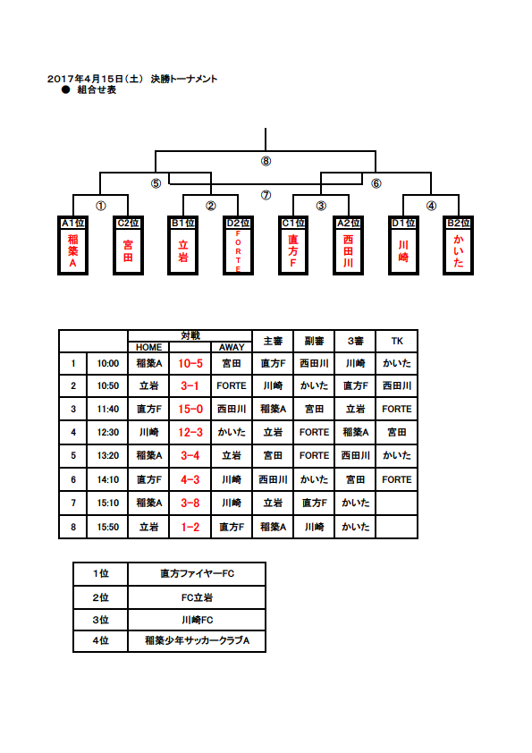 優勝:直方ファイヤーFC準優勝:FC立岩3位:川崎FC4位:稲築少年サッカークラブA