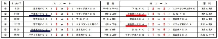 【結果】 優勝:平良第一FC A 準優勝:マティダ東 A 3位:宮古南FC A 4位:宮古北SC A 5位:久松FC 6位:マティダ東FC B