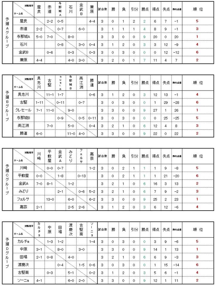 【結果】優勝:与那城FC A準優勝:勝連FC3位:FCクレセール4位:金武FC A5位:フェルサFC6位:みどりキッカーズ7位:中原FC8位:高江洲FC