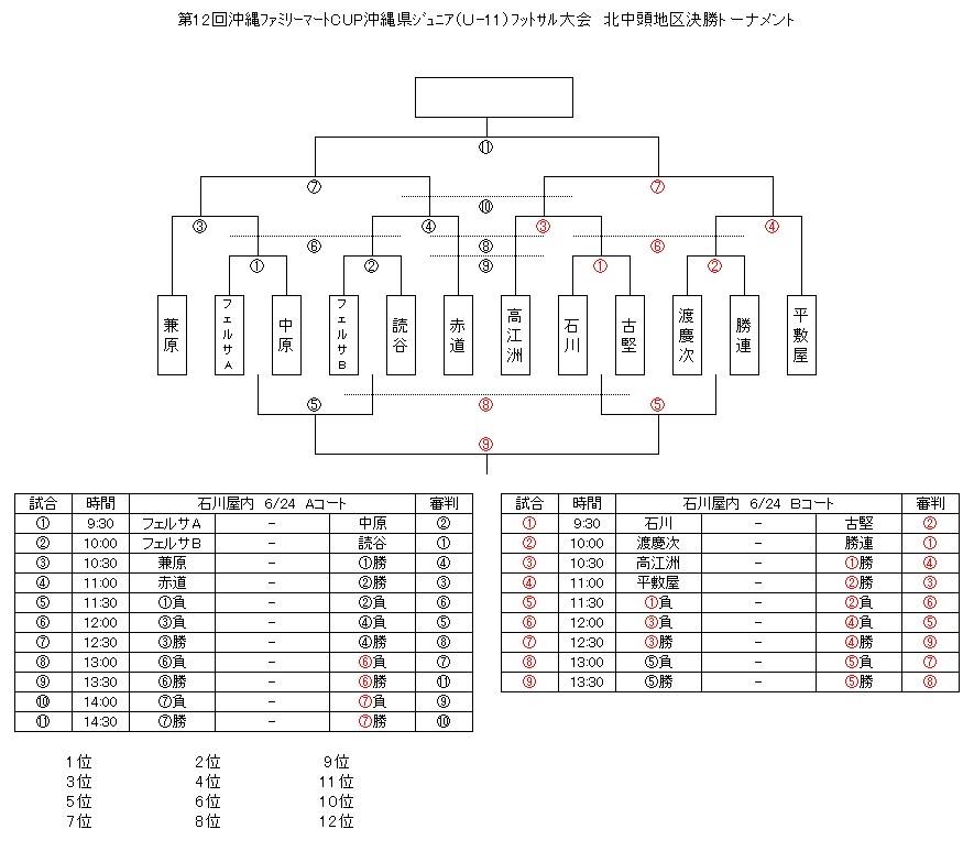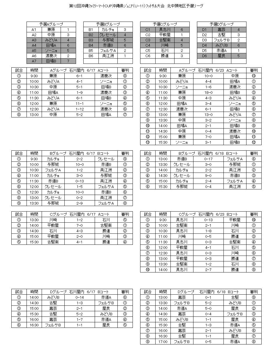 優勝:兼原FC 準優勝:高江洲FC 3位:読谷カルチョ 4位:渡慶志FC 5位:フェルサFC A 6位:平敷屋FC 7位:赤道クラブ 8位:石川FC 9位:中原FC ・・・以上県大会出場チーム・・・ 10位:勝連FC 11位:古堅FC 12位:フェルサFC B