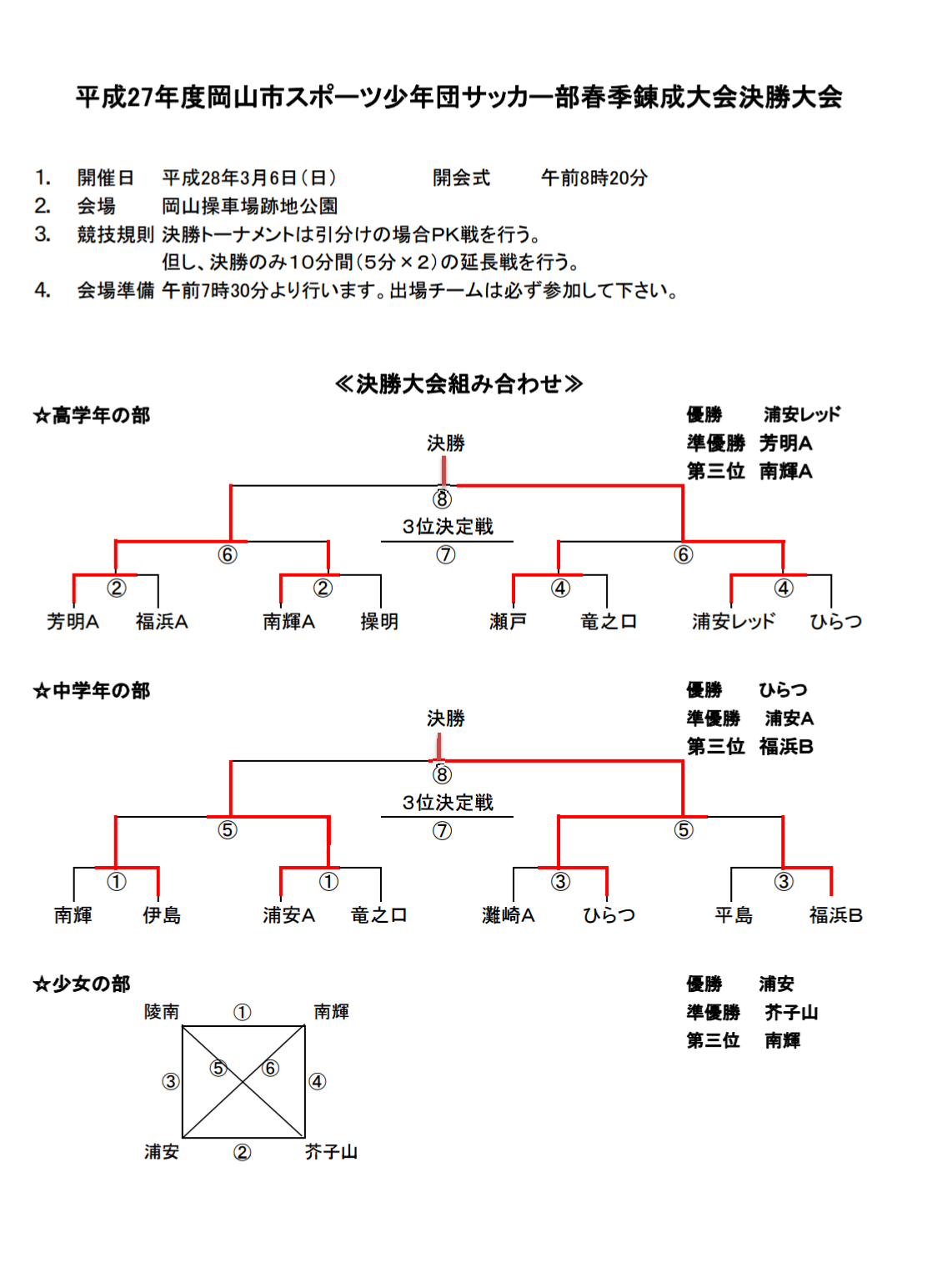 参照:平成27年度岡山市スポーツ少年団サッカー部秋季錬成大会決勝大会 《決勝大会組み合わせ》