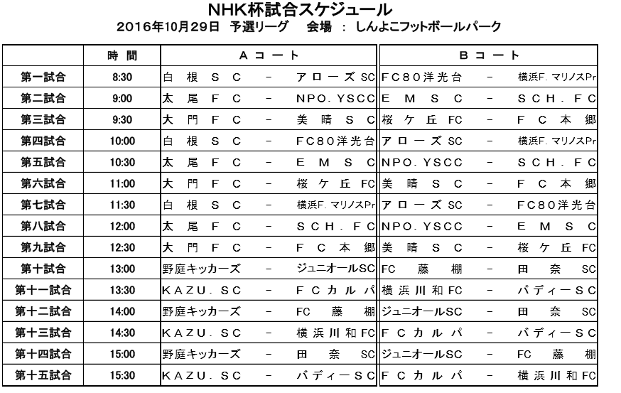 NHK杯ジュニアサッカー大会が横浜市予選となり優勝、準優勝、3位のチームが12月に行われる神奈川県大会に出場できる。