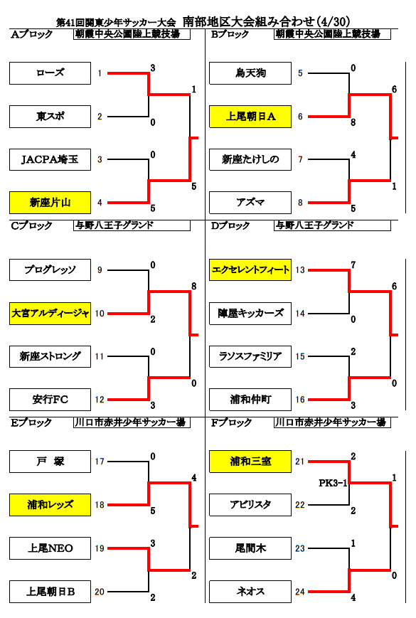 Aブロック代表:新座片山Bブロック代表:上尾朝日ACブロック代表:大宮アルディージャDブロック代表:エクセレントフィートEブロック代表:浦和レッズFブロック代表:浦和三室