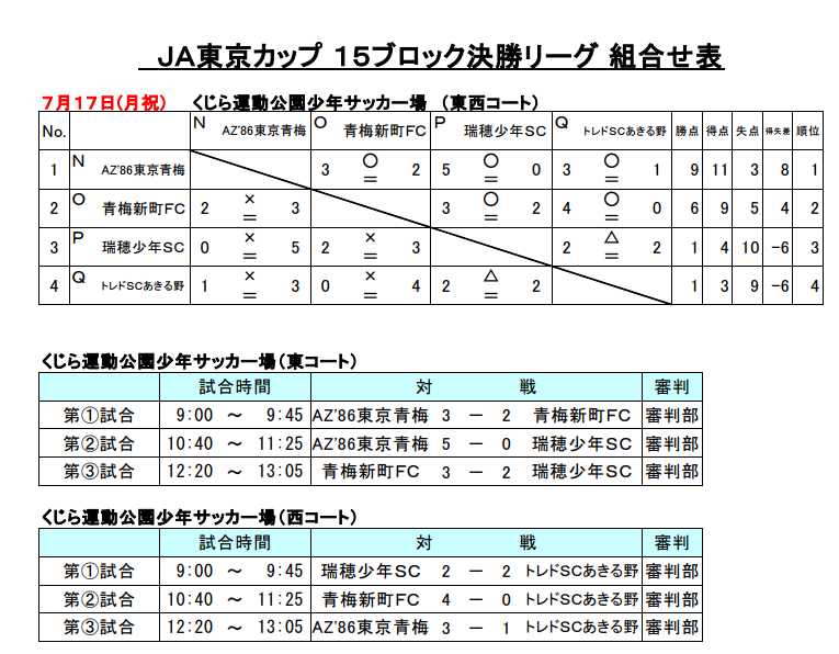 予選リーグ:6月18日(日)、24日(土)、25日(日) 予備日 7月2日(日)、8日(土)