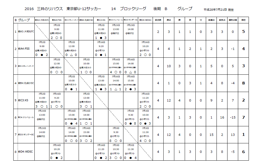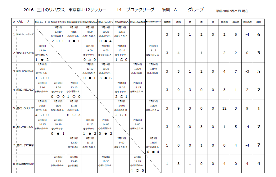 2016年度の三井のリハウス 東京都U-12サッカー14ブロックリーグ 前期リーグは、8チーム×4グループのリーグ戦+各グループの順位別での4チーム×8グループでのリーグ戦(チャレンジリーグ)で1チームあたり10試合を行います。