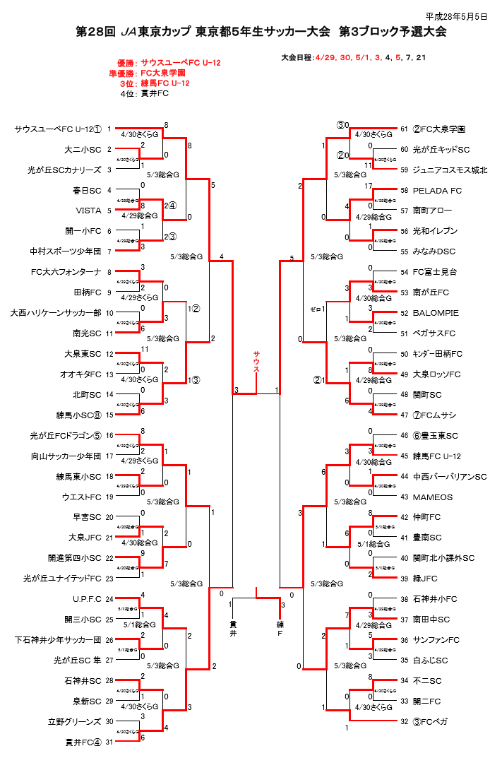 第28回JA東京カップ東京都5年生サッカー大会 第3ブロックの代表チームを決める大会です。61チームによって行われ、上位3チームが東京都中央大会へ進出します