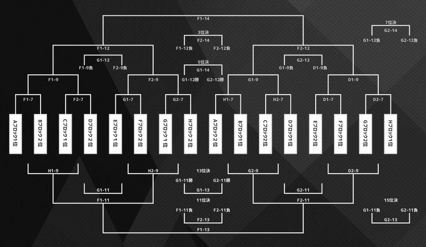 32チームが参加して、4チームずつ8ブロックに分けてリーグ戦を行う。