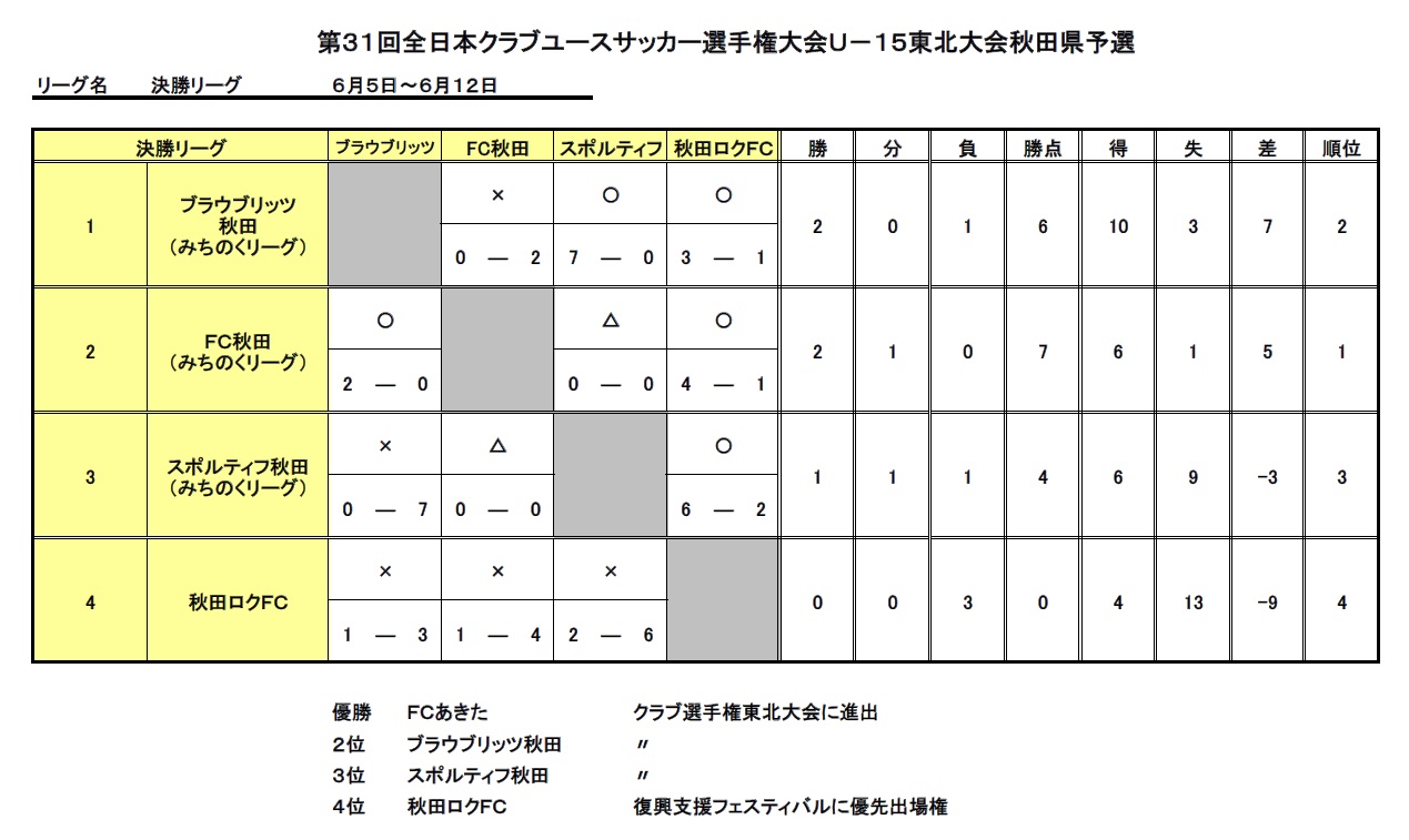 優勝:FCあきた準優勝:ブラウブリッツ秋田3位:スポルティフ秋田4位:秋田ロクFC