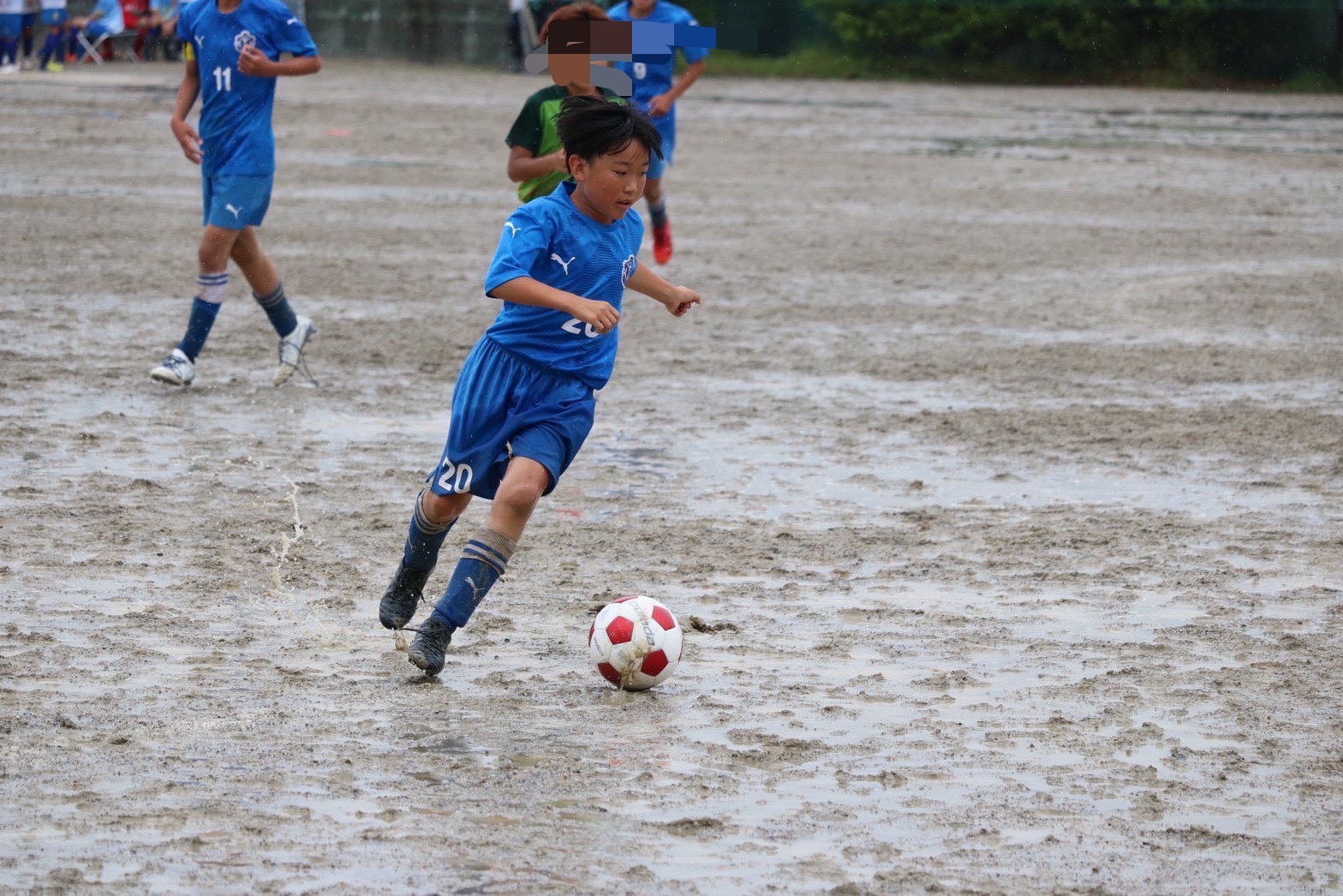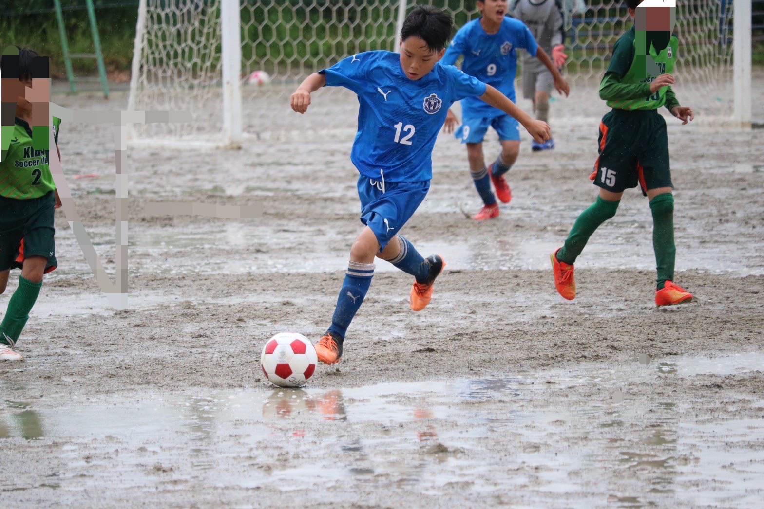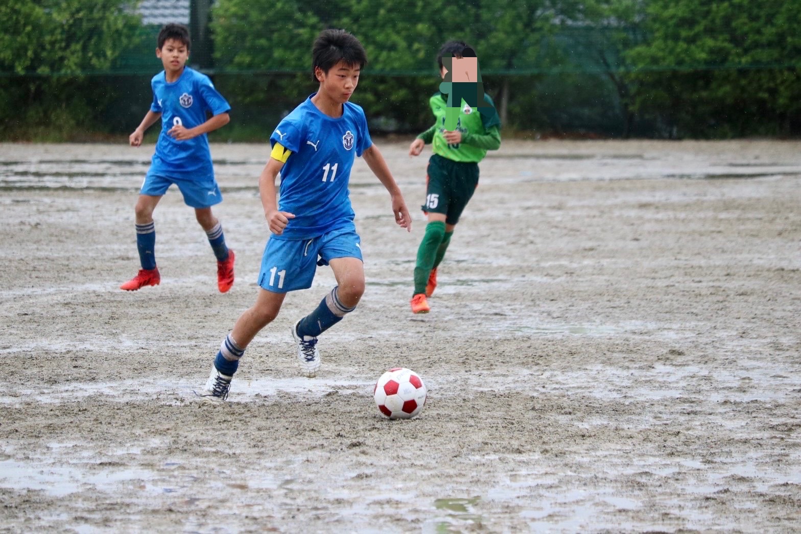 昨日から降り続く雨でグランドはドロドロ、パスもドリブルもシュートも水たまりで止まってしまう状況の中、泥だらけになりながらも選手達は懸命に走り、両チームとも一進一退の攻防戦を繰り広げました。最後の最後で力負けしてしまいましたが、自分たちの今後の課題が見えた試合になった気がします。
