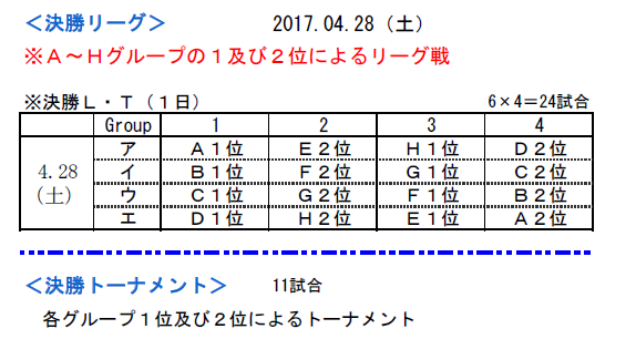 ・リーグ戦の順位決定は、(1)勝点(勝3・分1・負け0) (2)得失点差 (3)総得点 (4)当該チームの勝敗 (5)抽選の順とする。